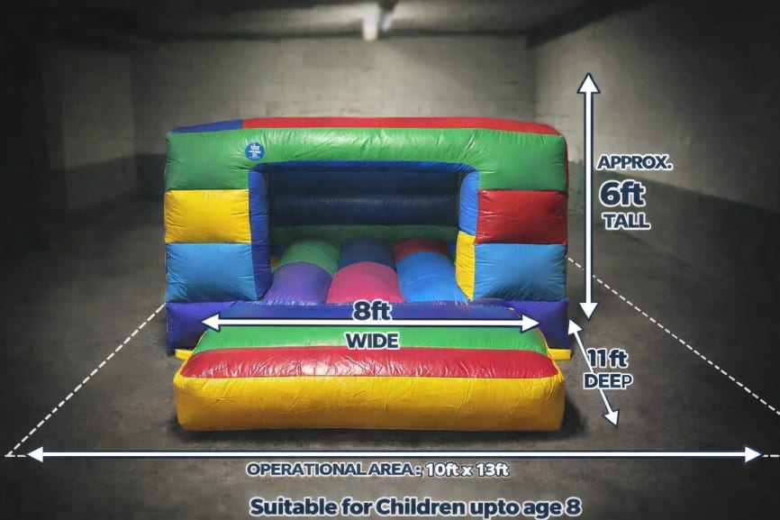 This is a very popular castle for the younger children and measures 8ft(w) x 11ft(d) x 5.5ft(h) . It is recommended for ages 8 and under.